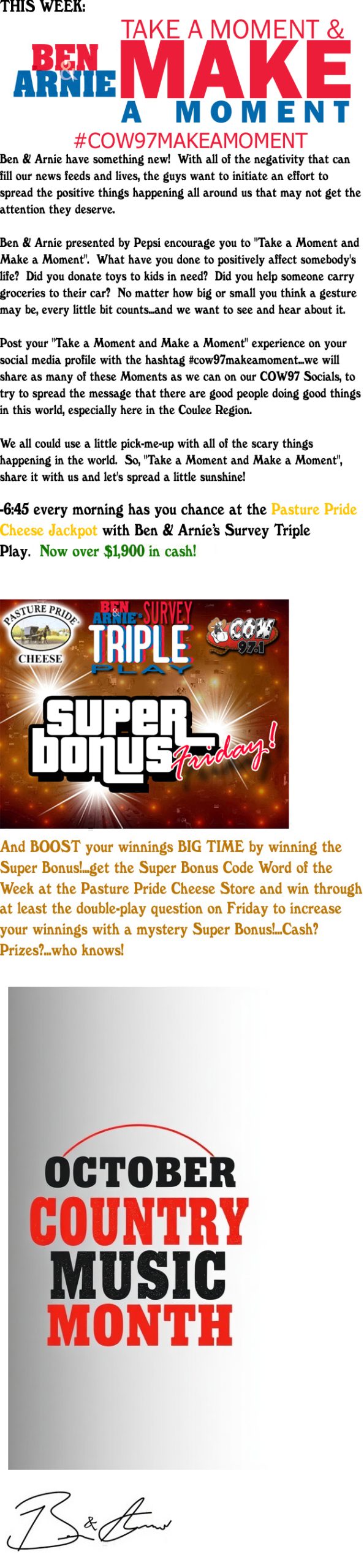I want to say “thank you.” I know there are choices in which station you listen to and the fact that you choose COW97 is just great! Call the COW lines anytime. This is your station and I feel privileged to be a part of your day!